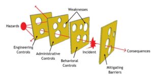 The Swiss cheese model of safety, developed by James Reason, is a risk analysis framework that illustrates how accidents occur when multiple layers, like slices of Swiss cheese, have holes (weakness) that align, allowing a hazard to pass through and cause an incident.